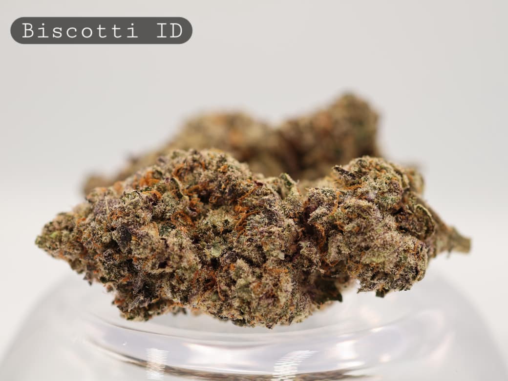 Biscotti produces dense, resin-heavy buds with deep green tones, occasional purple hues, and bright orange pistils. A thick coating of trichomes gives the flowers a frosted, premium finish. When broken open, the buds release aromas of sweet baked cookies, diesel fuel, and light spice. The flavour is rich and layered, offering sugary dough on the inhale followed by gassy, earthy undertones on the exhale.