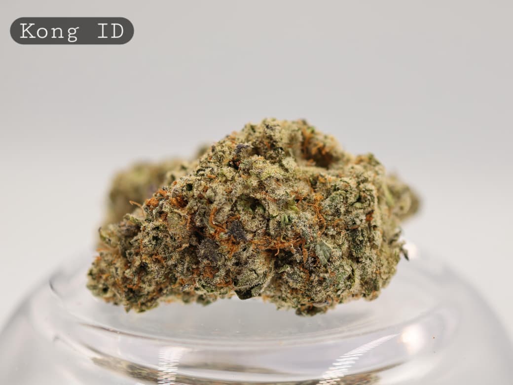 Kong produces dense, chunky buds with a solid structure and a thick coating of trichomes. Indoor-grown flowers typically display deep green tones with occasional darker accents and bright orange pistils. When broken open, the buds release earthy, musky aromas layered with herbal kush and a hint of fuel. The flavour follows through smoothly, offering earthy spice on the inhale and subtle gas notes on the exhale.